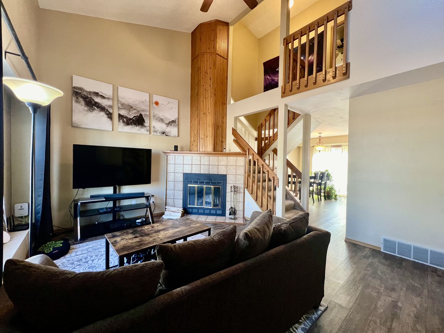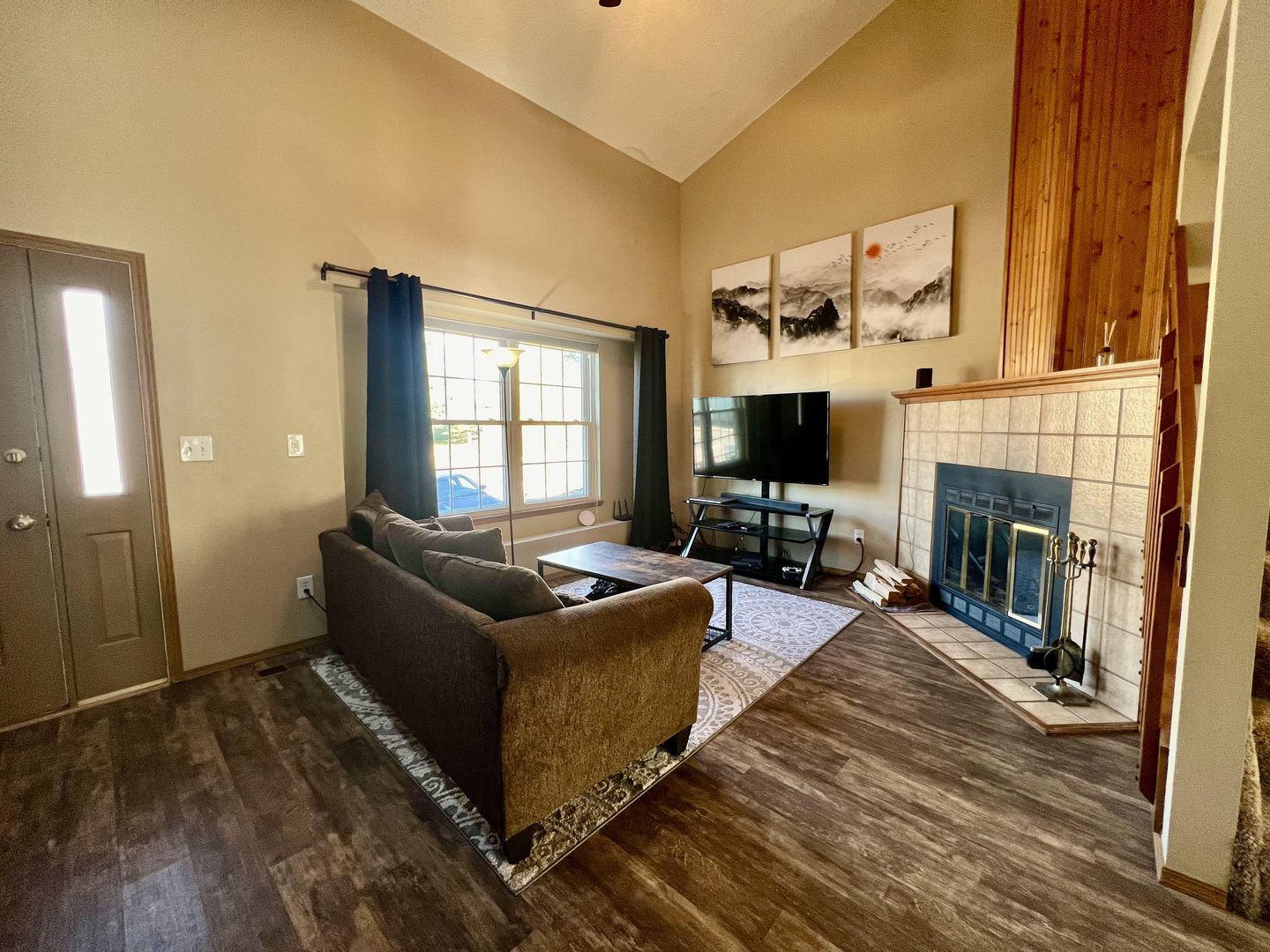 LVP flooring through main level, living room features vaulted ceilings, picture window and wood fireplace with beautiful lined wood surround. Large dining area walks out to private garden patio with flagstone patio. Lovely kitchen with