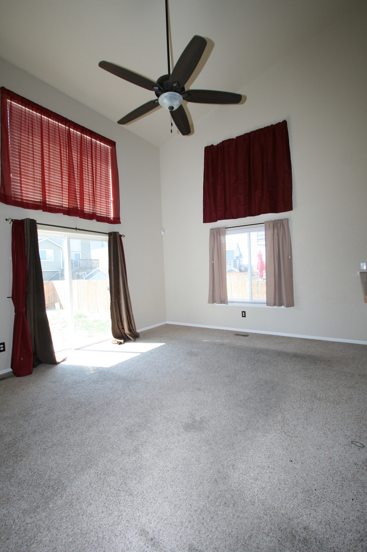 This lovely property has new carpet throughtout! Covered front porch enters to formal living room with 10+ft ceilings, great office or flex space! Open kitchen with soaring ceilings, recessed lighting, counter bar, and pantry! Adjacent family room walks out to fenced backyard. Primary bedroom on main level with attached 5 peice bath and walk in closet! Upper story includes 2 additional bedrooms with ample closet space, full bath and cozy loft area. Unfinished basement for plenty of additional storage! Additional features include central air, provided washer/dryer and auto-sprinkler system. Easy access to Powers Corridor and Fort Carson.